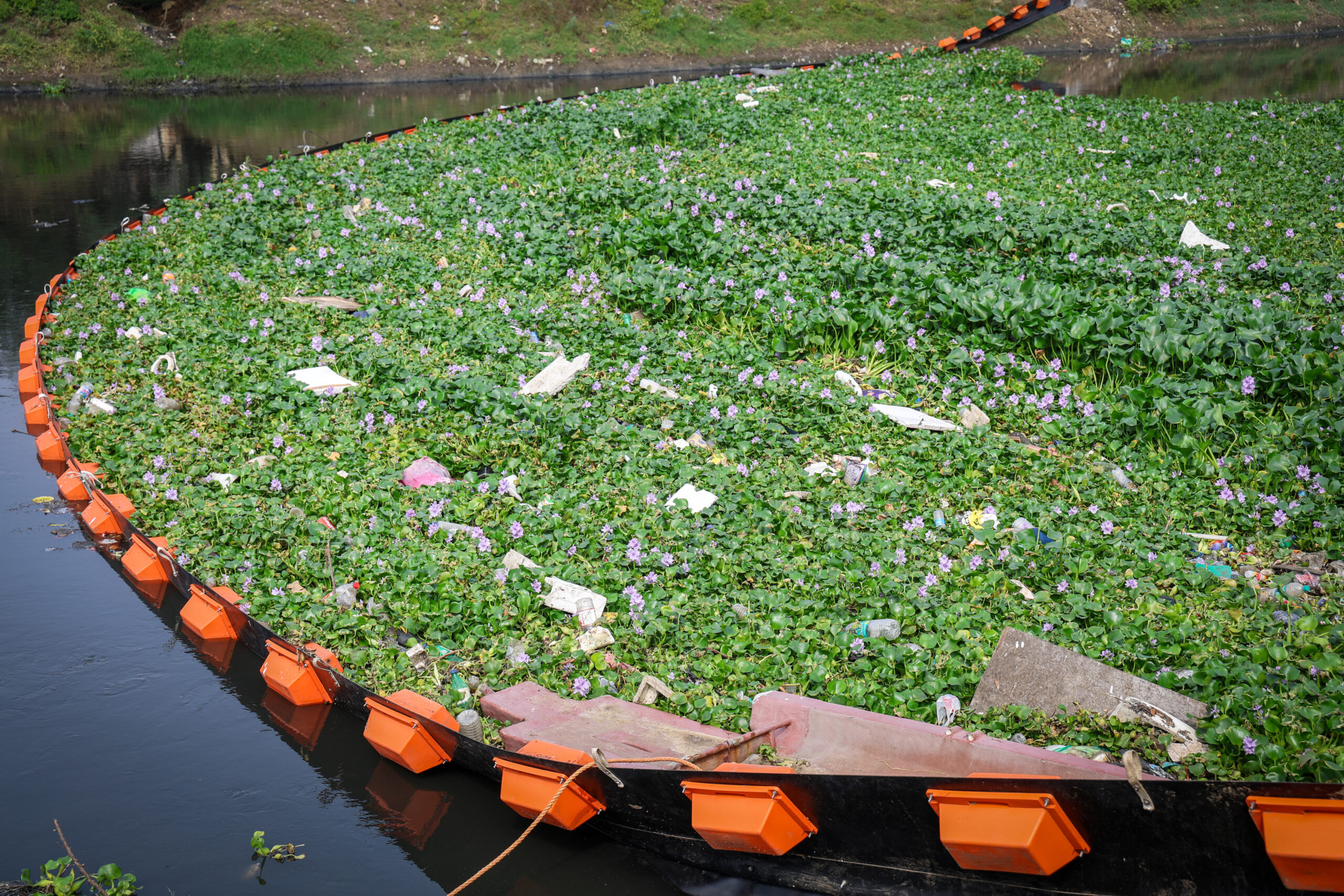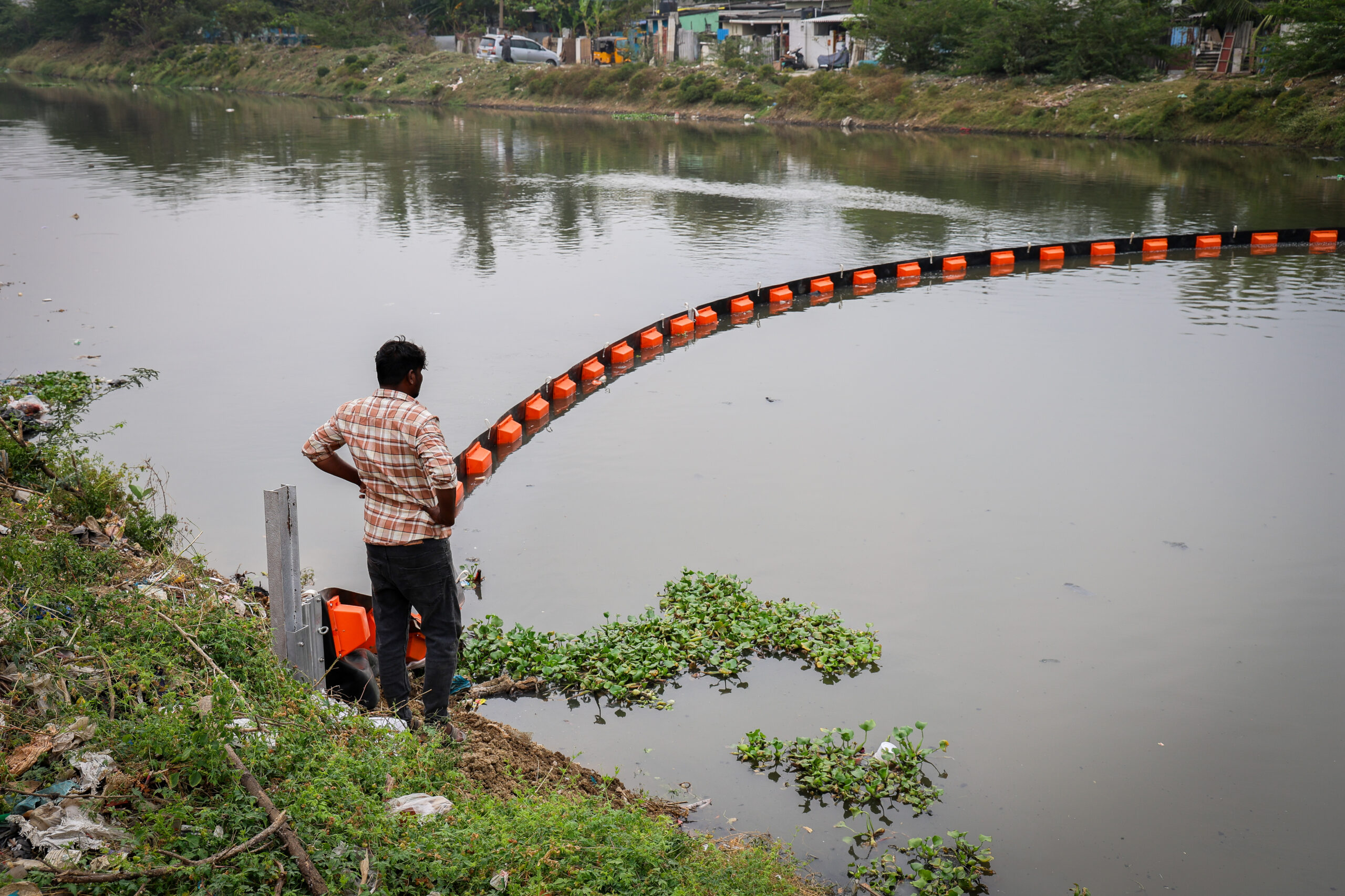 Floating trash barrier, Buckingham Canal, Chennai. Day 1.